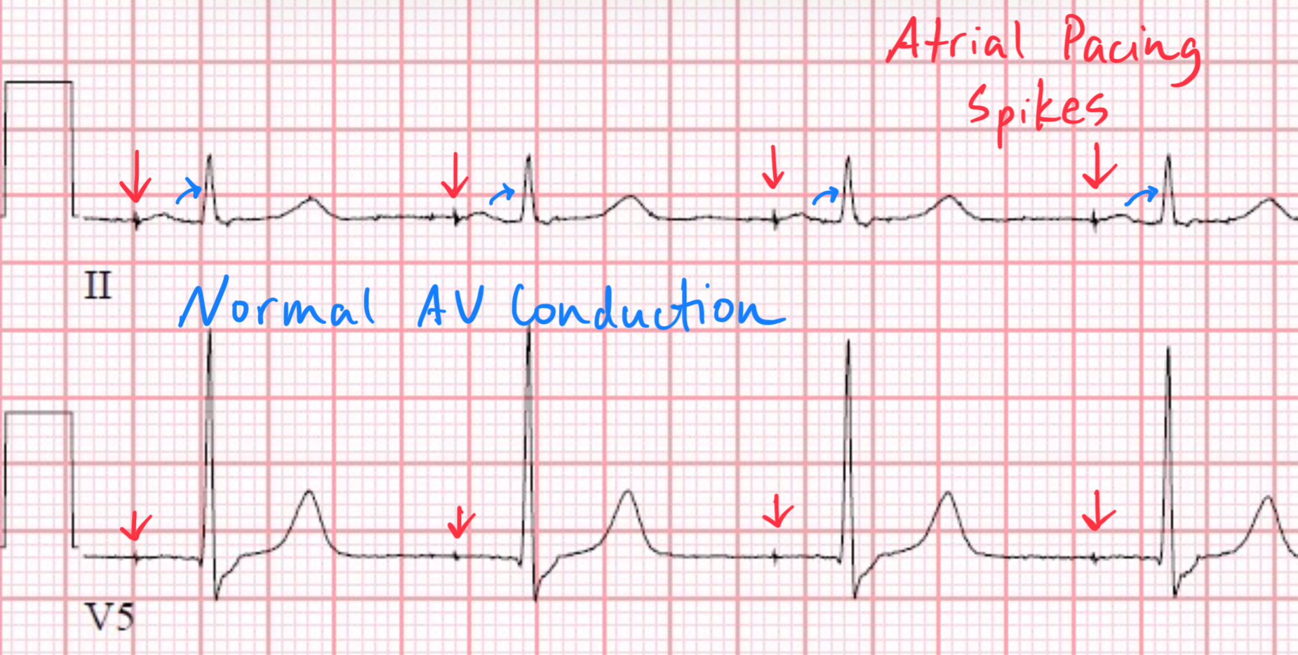 When the sinus node fails to fire within the Lower Rate Interval (LRI), the pacemaker emits an atrial pacing spike.
