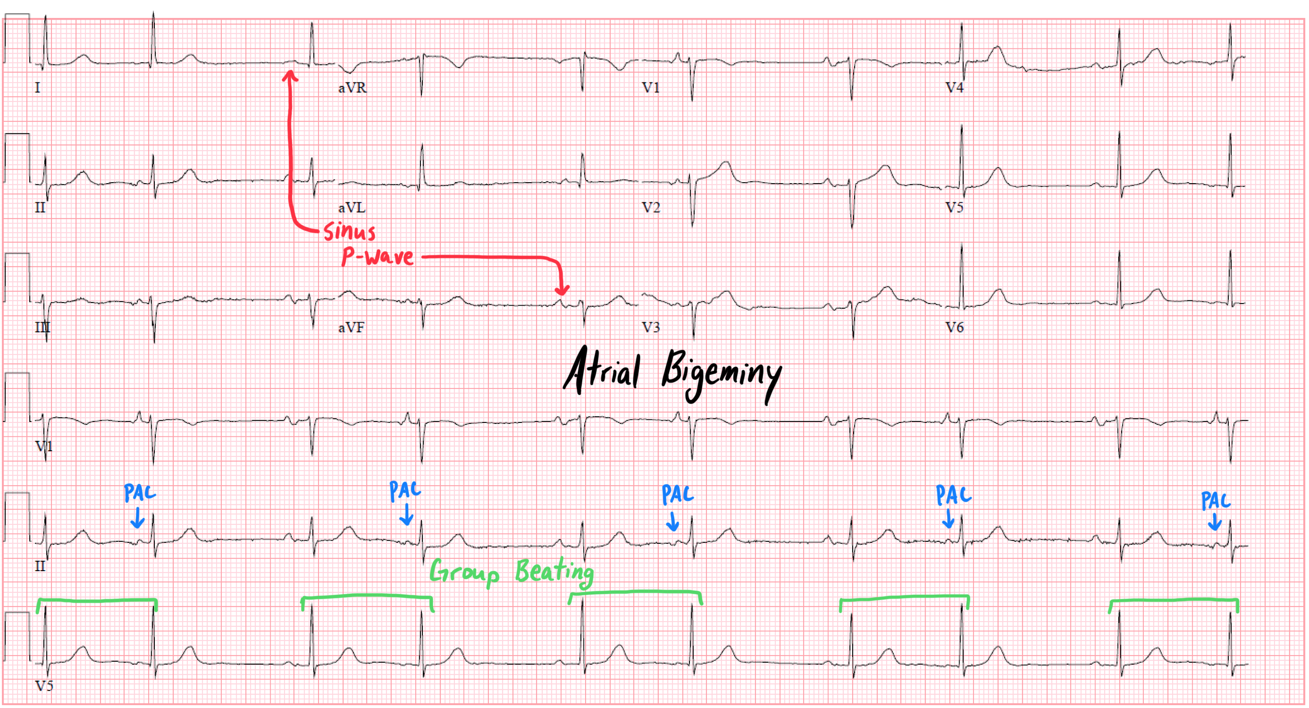 Sinus beat → premature atrial contraction (PAC) → pause → repeat