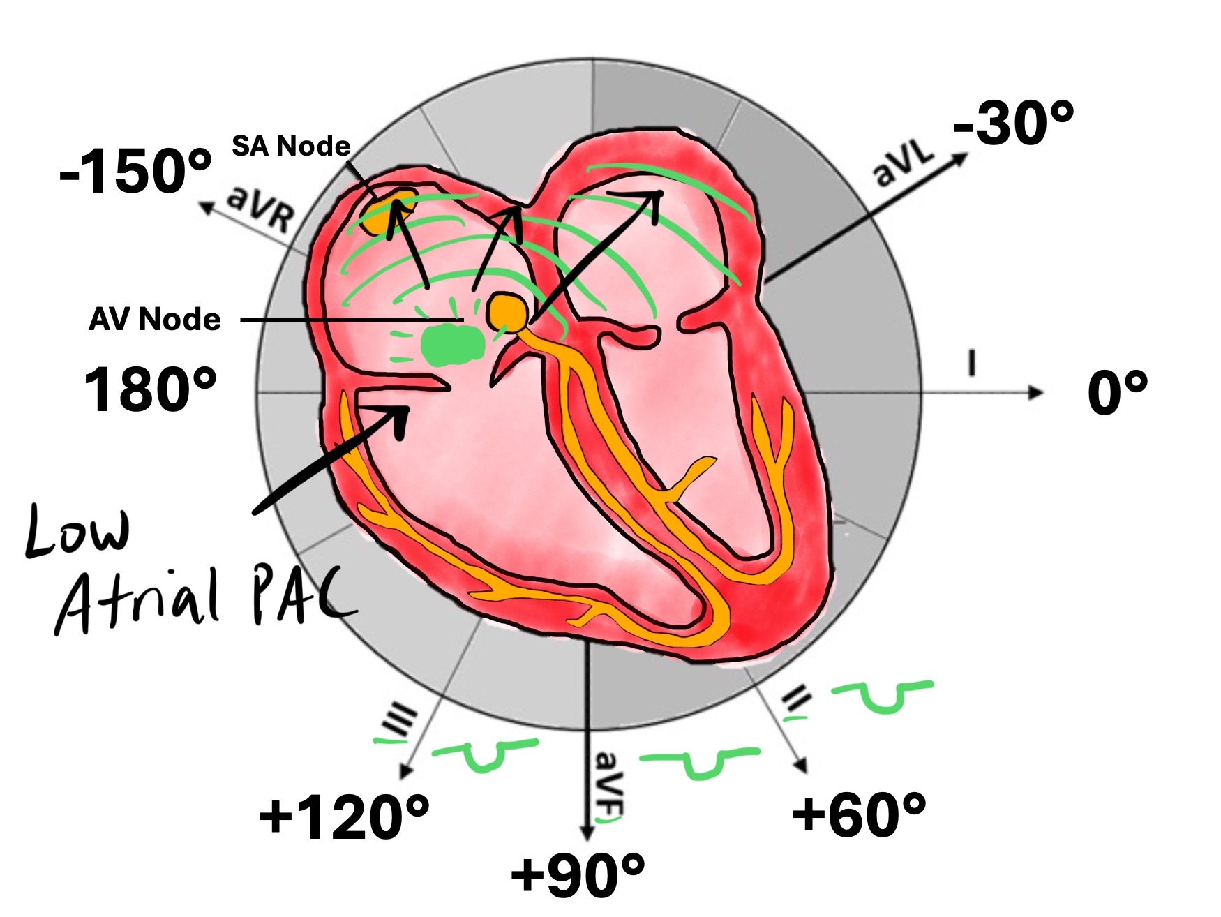 Low-atrial PAC → Retrograde activation of the atria creates inverted P waves in II, III, aVF.