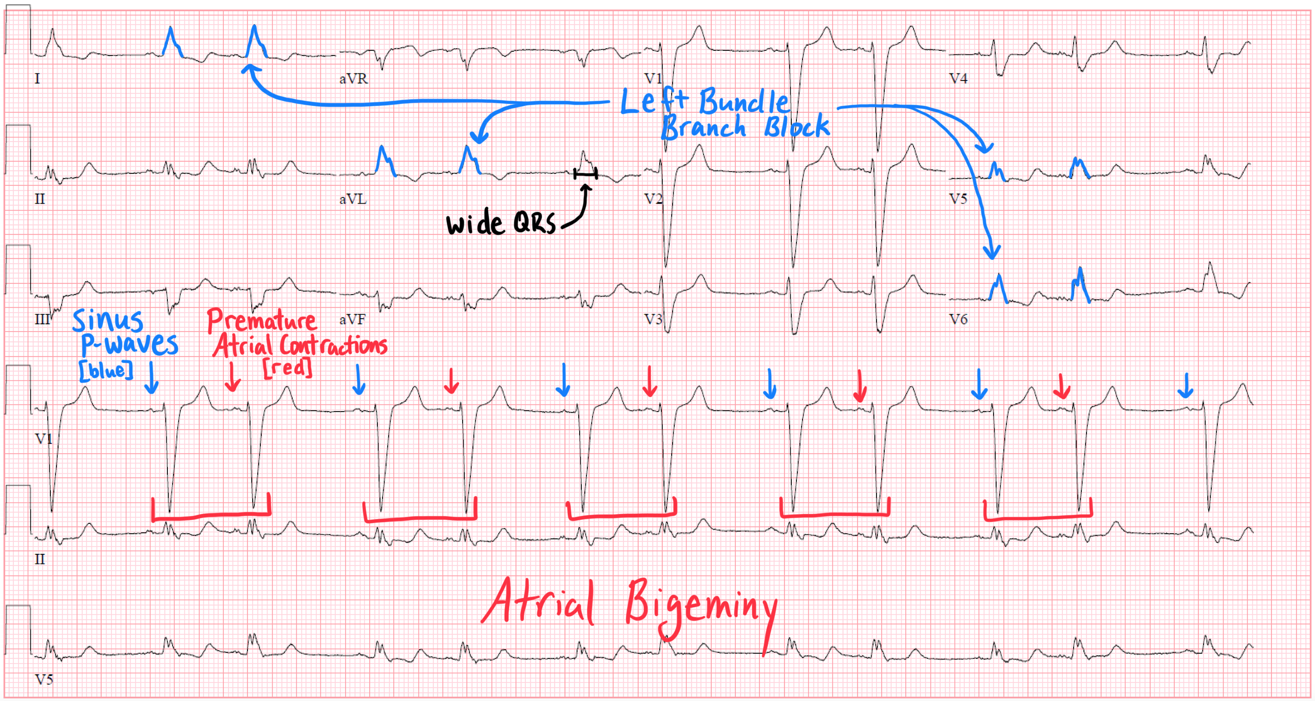 Interpreting ECGs in clinical practice is rarely about identifying a single abnormality. More often, the tracing is a layered story—atrial findings, ventricular conduction patterns, repolarization changes, and rate-dependent phenomena all stacked together. This week’s ECG is a perfect example: atrial bigeminy coexisting with left bundle branch block (LBBB).